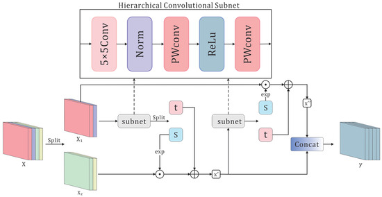 In a hierarchical convolutional subnetwork, the 5 × 5 convolutional kernel is employed for spatial feature extraction due to its ability to capture a wider range of local information. Owing to its extended receptive field, this kernel can detect texture details and local patterns at elevated levels. Instead of batch normalization, which relies on batch statistics, we use layer normalization (LayerNorm) to normalize channel activations for each sample independently. LayerNorm stabilizes neuron input distributions, mitigates gradient vanishing and explosion, and accelerates convergence. Moreover, by normalizing the scale variations introduced by 5 × 5-kernel outputs, LayerNorm reduces sensitivity to distributional shifts and further enhances training stability and efficiency. Drawing inspiration from [40,41,42], we adopt an inverted bottleneck structure. In this design, the initial 1 × 1 convolution facilitates cross-channel information exchange and expands the channel dimension, allowing the flow-based model to acquire higher-dimensional features. Subsequently, a 1 × 1 convolution restores the channel count to match the input, thereby preserving the reversibility of the flow model.