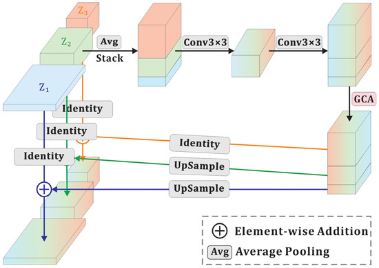 The three inputs are maps that are first downsampled to a unified spatial resolution using average pooling (AP). These downsampled maps are concatenated to capture the local information through the 3 × 3 convolution in the bottleneck structure. Given that feature maps at different scales contribute unequally to the final anomaly map, it is both reasonable and effective to assign adaptive weights to different channels. To this end, we employ the GCA module to extract channel weights. Finally, the fused feature map is divided into three segments along the channel dimension. Each segment is upsampled to its original resolution via bilinear interpolation and then combined through element-wise addition to produce the final fused output.