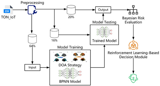 - Dataset Splitting: The dataset was first split into two parts, with 80% allocated to the DOA-BP intrusion detection module and the remaining 20% reserved for the Bayesian risk scoring and reinforcement learning–based response modules. Within the 80% assigned to intrusion detection, an additional 80:20 split was applied to create the training and test sets. This two-stage partitioning yields a final distribution of 64% for training, 16% for testing, and 20% for evaluation of downstream components. This hierarchical strategy ensures data independence between modules, prevents information leakage, and supports unbiased performance evaluation. Stratified sampling was employed throughout to maintain consistent class distribution across all subsets.