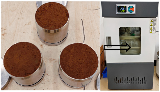 where θ is porosity, p b is bulk density, p s is soil particle density, m w is the mass of wet soil with water, V is the soil volume, σ is the water content, and m d is the mass of dry soil. The weighed soil and water were mixed well and poured into a 100 cm3 ring cutter, and the soil was pressed thoroughly into the inside of the ring cutter using a hydraulic press to simulate the morphology of soil samples collected from agricultural fields. To avoid the influence of variables such as water content and ambient temperature on the experimental results, the water content was set at 18%, and the prepared soil samples were placed in an insulated box at 25 °C for 24 h, as shown in Figure 1. The ring cutters were wrapped with plastic wrap to prevent water evaporation. Thirteen soil samples with porosities of 30%, 32.5%, 35%, 37.5%, 40%, 42.5%, 45%, 47.5%, 50%, 52.5%, 55%, 57.5%, and 60% were prepared, which covered the common porosity sizes in agricultural soils to ensure the generalizability of this soil porosity testing method.