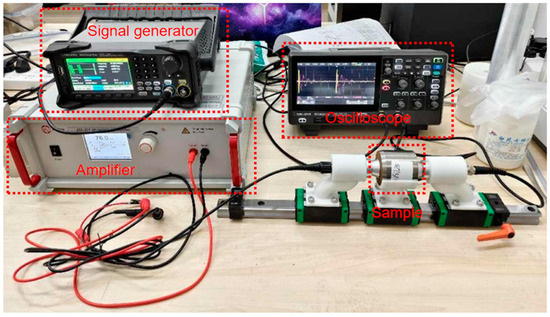 The ultrasonic data acquisition equipment is shown in Figure 2, consisting of an SDG1022X Plus signal generator (SIGLENT, Shenzhen, China), SDS802X HD oscilloscope (SIGLENT, Shenzhen, China), and Aigtek ATA-214 high voltage amplifier (Aigtek, Xi’an, China). As the soil attenuation of ultrasonic waves is more obvious, high-frequency ultrasonic waves propagating in the soil are more likely to be affected by particle scattering, resulting in signal attenuation and distortion, so the ultrasonic transducer is selected as two low-frequency planar transducers with a center frequency of 50 kHz to enhance the ultrasonic penetration. Also, since transverse waves can only propagate in solids, and liquids and gases are usually still present in the soil, ultrasonic transducers capable of generating longitudinal waves are selected. The excitation signal of the signal generator is a 50 kHz pulse string with 12 pulses, a repetition period of 100 ms, and an amplitude of 4 Vpp. The amplitude of the excitation signal is amplified to 300 Vpp by a high-voltage amplifier to provide a sufficiently large voltage to stimulate the ultrasonic transducer to generate a strong enough ultrasonic pulse. Since the ultrasonic signal contains rich frequency components and rapidly changing waveform characteristics to make the signal waveform smoother and more accurate to avoid losing important information, the sampling rate of the oscilloscope is set to 1 Msa/s, which is much larger than the frequency of the ultrasonic signal and satisfies the Nyquist sampling theorem. The experiment used the ultrasonic transmission method to collect data from soil samples, and the ultrasonic transducer was fixed using a device with a guide rail to facilitate the contact and separation between the ultrasonic transducer and the soil samples. To ensure that the ultrasonic transducer can be completely affixed to the soil, we have coated both ultrasonic transducers with a coupling agent specially designed for ultrasonic flaw detection, and pushed the slider carrying the ultrasonic transducer to make the ultrasonic transducer and the soil gradually come into contact with each other, and when the oscilloscope waveforms are gradually visible and stable, the position of the slider will be fixed, and the data will be collected. There are 13 samples in this experiment. In order to have more data to train and test the soil porosity detection model, and in order to reduce the error caused by a single detection and improve the generalization of the model, each sample is collected every 30 s, a total of 10 times, and then exchange the position of the transmitter transducer and the receiver transducer and repeat the above operation. Finally, a total of 260 raw data points are collected in this experiment.