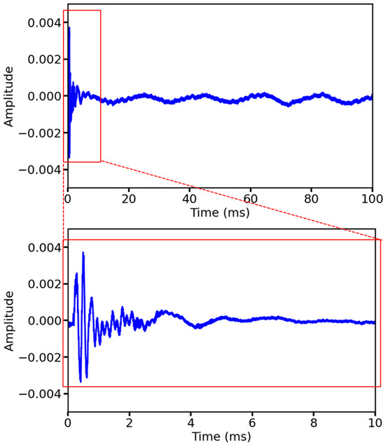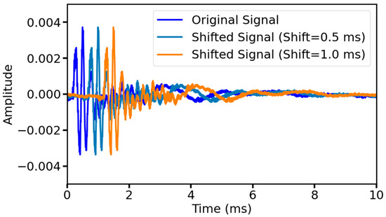 In actual measurements, ultrasonic signals may be offset in time due to equipment start-up time, signal transmission delays, etc. These temporal variations can be simulated by augmenting the original data with time-shifted data to make the model more robust. Moreover, even though the porosity of different soil samples may be the same, due to the different particle distributions of varying soil samples and the spatial heterogeneity of pore connectivity, the acoustic propagation paths may have differences in the bypass paths leading to local delays, and the time-shift operation can approximate the characterization of such natural fluctuations. To avoid the loss of information in the first wave by time-shifting the signal to the left, two degrees of time-shifting were applied to the right for all the original data in this study, namely, 0.5 ms to the right and 1 ms to the right, respectively. Figure 6 shows the original signal as well as the signal after time-shifting.