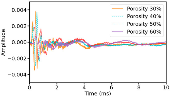 The collected ultrasonic data are 100 ms as a cycle because in ultrasonic nondestructive testing, the information related to the material properties can usually be analyzed from the first wave of the waveform and the subsequent attenuation until the smooth process [30], and to reduce the redundancy of the data, the complexity of the network model, and the memory pressure and accelerate the speed of the detection of the soil porosity, in this study, we selected the 0–10 ms portion of the waveform data for analysis and training, including 10,000 sampling points, which belong to long-term series data. Figure 3 shows the waveforms of the raw signal and segment signal (the segment signal is taken as the original signal in the subsequent description). From Figure 4, it is evident that with the increase in porosity, the amplitude of each peak of the waveform as a whole is reduced, and the appearance of the first wave is delayed, that is, the propagation speed of ultrasonic waves is slowed down, from which it can be illustrated that some features of ultrasonic waveforms and the soil porosity have a coupled relationship.