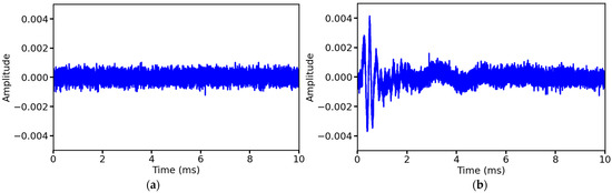 Ultrasonic signals are susceptible to transducer electronic noise and environmental coupling noise, and the statistical properties of these noises are highly consistent with Gaussian white noise [31]. Gaussian white noise has the power spectral density characteristics of white noise in the frequency domain, i.e., the frequency components are uniformly distributed, the samples are independent of each other in the time domain, and its amplitude obeys a Gaussian distribution. By adding Gaussian white noise of controllable intensity to the original signal, the model can be forced to learn the physical nature of the noise-independent features while preserving the core acoustic features of the ultrasound detection signal. In this study, two types of Gaussian noise with positive and negative signal-to-noise ratios (SNRs) are added, with the noise intensity interval of 3 for positive SNRs set to 5, 8, 11, 14, 17, and 20, respectively, and the noise intensity interval of 2 for negative SNRs set to −4, −6, and −8, respectively, to avoid the noise being too large to be detached from the actual detection environment. The above noise settings cover the whole scene from the laboratory to the farmland, sufficient to simulate most noise disturbances in the real environment. A positive SNR indicates that the original signal strength is greater than the noise intensity, and the larger the absolute value, the smaller the relative noise intensity; a negative SNR indicates that the original signal strength is less than the noise intensity, and the larger the absolute value, the larger the relative noise intensity. Figure 5 shows the Gaussian white noise with an SNR of 5 and the signal after adding Gaussian white noise. Gaussian white noise is generated as follows:
