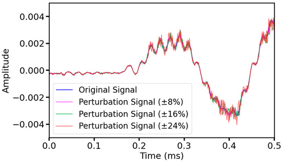 Similarly, ultrasonic signals may be affected by various other unpredictable disturbances in real measurements, resulting in amplitude variations. By adding random amplitude perturbations, the model can be better adapted to these variations, improving the model’s performance in the face of disturbances and anomalies and enhancing the model’s robustness. Therefore, in this study, three scales of random perturbations were added to all the original data, namely 8%, 16%, and 24%, respectively, to allow the amplitude of each sample point in the ultrasound signal data to be randomly increased or decreased within the corresponding range, e.g., when the perturbation scale was 8%, the value of each sample point in the ultrasound sequence data was made to vary randomly within the range of ±8%. Figure 7 shows the original signal and the signal with the added amplitude perturbation.