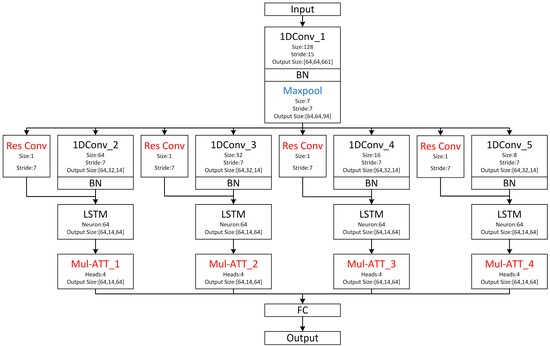 Based on the multi-scale CNN-LSTM, we propose the MSRCNN-LSTMATT model, and the model structure is shown in Figure 8. The original ultrasound data contains a large number of sampling points; if the original data is directly trained, it will lead to too many model parameters, increasing the computational complexity, and at the same time, it may introduce a large amount of noise and redundant information, which leads to a decrease in the generalization ability of the model and thus overfitting. Using a large convolutional kernel to extract features from the data can capture a larger feature area, and better identify the global features in the data; at the same time, the data can be downscaled. However, the convolutional kernel is not as large as the better, too large convolutional kernel will lead to an increase in the amount of computation and memory consumption. Thus, the first 128 × 1 convolutional kernel should be used for feature extraction and downscaling of the original data, and at the same time, the step size will be set to 15 to further improve the dimensionality reduction capability of the convolutional kernel. The batch normalization layer is accessed behind the convolutional layer, which is responsible for normalizing the output of the convolutional layer, reducing the internal covariate bias, accelerating the training process, and at the same time, it can be viewed as a means of regularization to improve the model’s generalization, and finally accessing the maximal pooling layer, which downsamples the data while maintaining the salient features, thus reducing the computational complexity and the number of parameters. The input to the first convolutional layer is the original ultrasound signal, while the output is an abstraction of the original signal, i.e., the feature map of the original signal. After extracting the generalized global features, further extraction of more subtle and abstract high-level features is required. Thus, multi-scale feature extraction of the feature map using smaller convolutional kernels is needed. Multiple small convolution kernels of different sizes are required to extract features of different frequencies, so four small convolution kernels of different sizes are used to convolve the feature map to increase the diversity of features, and a batch normalization layer follows each small convolution kernel. It is worth noting that in a typical CNN, small convolutional kernels (e.g., 3, 5, 7) are sufficient to extract local features. However, in ultrasonic soil detection, an important phenomenon is the long-range dependence, which is manifested by the fact that a signal response that may be earlier in the soil waveform is associated with subsequent multipath propagation features. This temporal dependence may span tens or even hundreds of sampling points. While traditional small convolution kernels need to be stacked with multiple layers to expand the receptive field, large convolution kernels can replace the function of stacking multiple small convolution kernels to see a larger range of signal structure at once without stacking many layers, thus avoiding gradient vanishing and inefficiency, which makes it more powerful for remote coupling feature extraction between the first waveform and the subsequent scattered waveforms. Therefore, even the “small” convolutional kernel used in this study is only relative to the first convolutional kernel, which actually belongs to the category of large convolutional kernels. We chose convolutional kernel sizes of 8, 16, 32, and 64, which is the classical exponential growth combination, has the advantage of guaranteeing a doubling of the perceptual field at each layer, allows for a large perceptual field without too many convolutional kernels, and ensures that the network can perceive at all time scales. Although a large size of convolutional kernel helps to model long time-dependent features, the number of parameters and computational overhead will increase significantly, which may also bring overfitting risk when the data volume is limited; in this paper, the size of convolutional kernel is controlled to be around 100, which takes into account the remote dependence modeling and model generalization ability. The features extracted from each of these four convolutional kernels were then fed into four separate sets of LSTMs to further capture the dynamics and long-term dependencies of these features over time. Due to the high porosity of the soil, ultrasonic wave propagation in the soil will cause a large attenuation. The waveform is prone to distortion, so the model adds a multi-head self-attention mechanism after each group of LSTMs, which can directly compute the relationship between all positions in the sequence. Even if part of the region is distorted, the lost information can be inferred through the relationship between the front and back of the other regions to improve the degradation of the model’s performance caused by the distortion of the waveforms. The LSTM output sequence will be mapped into multiple different representation spaces. Each attention head focuses on capturing the information under different subspaces in the sequence [34], capturing key features in the ultrasound signals from multiple perspectives, enabling the model to comprehensively comprehend the complex patterns and structures in the sequence data, even in the presence of waveform distortion due to high porosity. After extracting features at different scales from different branches of the CNN-LSTM-ATT, they are spliced and fed into the fully connected layer so that the different features can complement each other. The final results of soil porosity detection are obtained. Due to the existence of deep network depth, to alleviate the problem of gradient vanishing [35] and make the network stable during the training process, a residual connection module is used in each set of CNNs, and a convolution kernel is added to the residual 