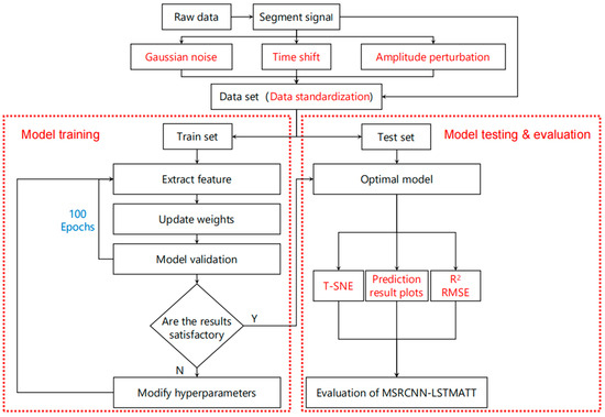 Before training the model, the data of each porosity label are randomly divided into the training set, validation set, and test set in the ratio of 8:1:1 to ensure that the model can fully and equally learn the features of ultrasound signal data of all porosities to obtain fairer experimental results. The model is implemented based on the PyTorch 1.13.0 framework, and the model training parameters are set as follows: the loss function is MSE because it is a widely used and valid objective for regression tasks. MSE penalizes larger errors more strongly and is particularly suitable for our normalized continuous porosity prediction, the optimizer is Adam because it has an adaptive learning rate mechanism and shows robust performance in a variety of tasks, especially in deep learning scenarios where the gradient is noisy or the dataset is small, the batch size is 64, which is a compromise between considering training stability and efficiency. A smaller batch size accelerates convergence and helps the model to get rid of local optima, but introduces more noise in the gradient estimation, while 64, a commonly used medium-sized batch size, strikes a good balance between computational efficiency and model generalization ability, the number of training iterations is 100 epochs, which is sufficient to ensure convergence while avoiding overfitting and wasting training time, according to the results of our multiple experiments, and the learning rate is an adaptive learning rate with an initial value of 0.0005 so that the model parameters can be adjusted more meticulously according to the gradient information during training. The model training flowchart is shown in Figure 9.