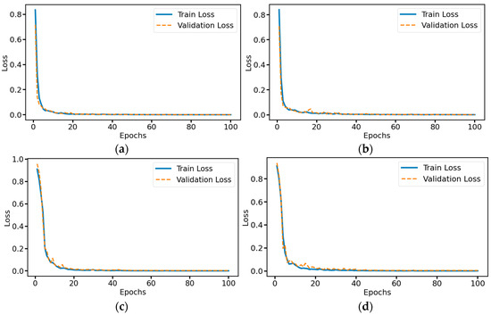 Figure 10. Training and validation loss curve of ablation experimental model: (a) Complete MSRCNN-LSTMATT; (b) MSRCNN-LSTMATT without residual connections; (c) MSRCNN-LSTMATT without multi-head self-attention; (d) MSRCNN-LSTMATT without residual connections and multi-head self-attention.