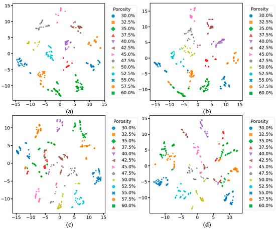 Figure 12. Visualization of data before the fully connected layer of different ablation models based on T-SNE: (a) Complete MSRCNN-LSTMATT; (b) MSRCNN-LSTMATT without residual connections; (c) MSRCNN-LSTMATT without multi-head self-attention; (d) MSRCNN-LSTMATT without residual connections and multi-head self-attention.