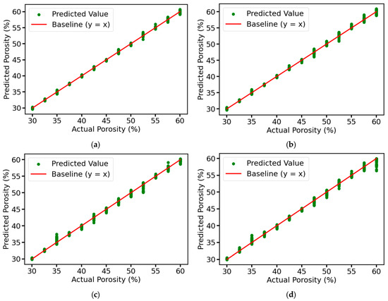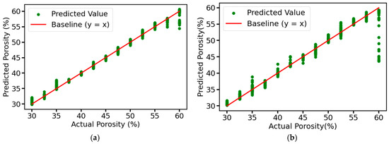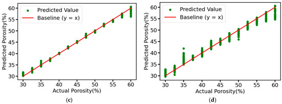 We use the prediction result plots to visualize the prediction results of each model for the test set in the ablation experiment, and use R2 and RMSE to evaluate the performance of the models. From Figure 13, it can be seen that the predicted values of the complete model are very close to the actual values, distributed in a narrow band, and most of the points are concentrated near the baseline, indicating that the model has very high prediction accuracy and fitting effect, and can accurately capture the intrinsic pattern of the data with almost no prediction error. As for the other three models, due to the removal of the corresponding modules, although the overall predicted values are still closer to the actual values, the distribution area is slightly wider than that of the complete model, resulting in some points deviating from the baseline by a longer distance, which may lead to the large deviation of the predicted values of some samples from the actual values. Figure 14 shows the values of R2 and RMSE of each model, the model with the residual connection module and multi-head self-attention mechanism module removed has an R2 of 0.9965, which is 0.0025 different from that of the complete model, both of which have good explanatory power. However, its RMSE is 1.24%, while the RMSE of the complete model is only 0.66%, which is reduced by about 46.77%, and the accuracy of the prediction results is higher. According to the results in Figure 14, it can be seen that the error is increased by about 24.24% after removing the residual connection module. In comparison, the error is increased by about 68.18% after removing the multi-head self-attention mechanism module. Although both are indispensable, the multi-head self-attention mechanism module plays a more critical role in the model than the residual connection module, which can more significantly improve the model’s feature extraction ability and prediction performance.