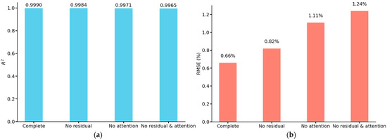 Figure 14. R2 and RMSE of the test set results for different ablation models: (a) R2 of different models; (b) RMSE of different models.