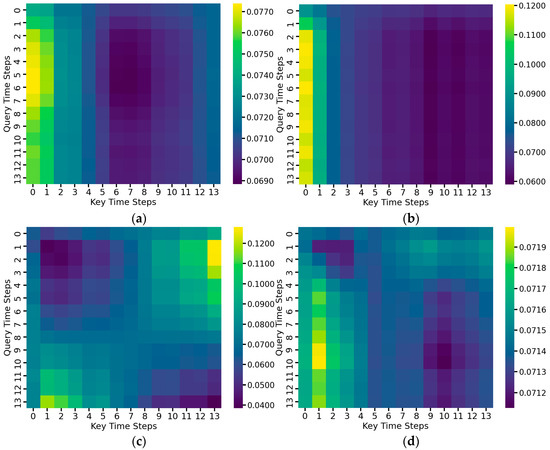 Figure 15. Heatmap of average multi-head attention weights for each attention layer of the MSRCNN-LSTMATT model: (a) Average weight of the first attention mechanism layer; (b) Average weight of the second attention mechanism layer; (c) Average weight of the third attention mechanism layer; (d) Average weight of the fourth attention mechanism layer.