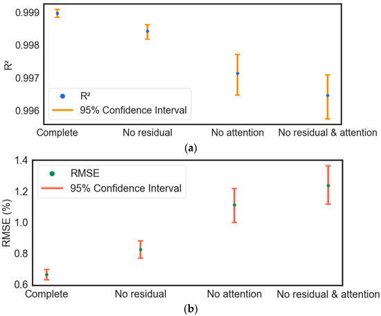 Figure 16. Visualization of 95% confidence intervals for R2 and RMSE in ablation experiments: (a) 95% confidence interval for R2; (b) 95% confidence interval for RMSE.
