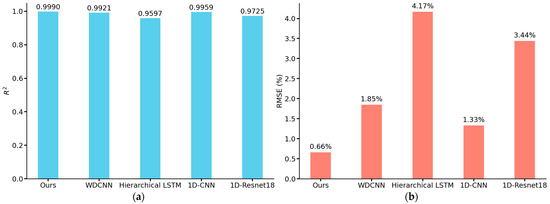 Figure 18. R2 and RMSE of the test set results for contrast models: (a) R2 of our model and contrast models; (b) RMSE of our model and contrast models.