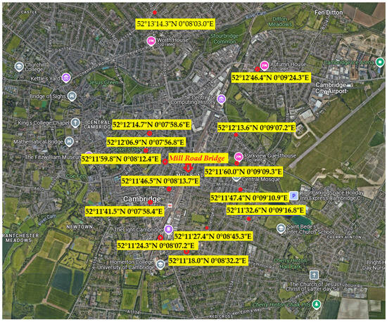 The Cambridge City Council conducted the Mill Road Sensor Project to monitor the impact of an eight-week closure of the Mill Road Bridge in 2019 during crucial rail service improvements by Govia Thameslink railway operating Southern, Thameslink, Great Northern and Gatwick Express. To better understand traffic patterns and environmental conditions, the Smart team installed 15 VivaCity traffic sensors (Figure 1 and Table 1) and the City Council deployed seven air quality sensors on and around Mill Road Bridge. These sensors are created by VivaCity Labs Limited in London, United Kingdom and were set up to monitor changes in road usage and air quality, particularly in response to the closure of Mill Road Bridge and its impact on surrounding streets. The sensors were originally installed in May 2019 for 18 months to gather data on pedestrians, bicycles, cars and other vehicles. This allowed the council to assess the closure’s impact on surrounding roads and air quality. Pedestrians and cyclists could cross via a temporary footbridge, except for a brief five-day period when the route was closed for safety. Although the initial monitoring period was set for 18 months, data collection via these sensors is still ongoing and is now part of a broader city-wide monitoring network aimed at improving urban planning, traffic management and environmental policies. The sensors collected hourly traffic data on the selected roads from 3rd June 2019 midnight to 13th December 2020 midnight (Table 1).