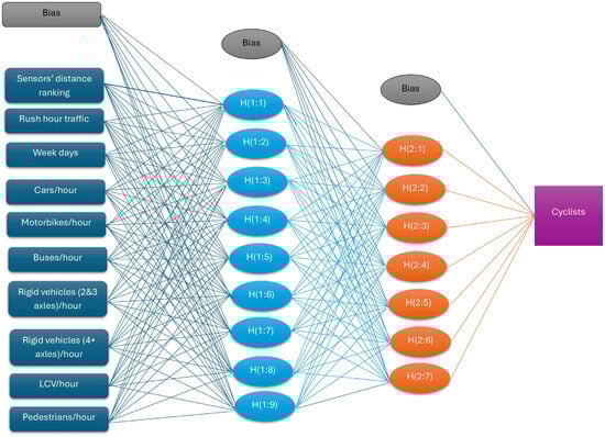 where represents element-wise multiplication and y is the observed output. Figure 2 shows the input, hidden and output layers of ANN models for bicycle traffic. The distance of sensors from the road closure, presence of rush hour traffic, days of the week (weekdays or weekends/bank holidays) and mixed traffic characteristics (number of cars, buses, pedestrians, other good vehicles and light commercial vehicles) are the neurons in the input layer. The first and second hidden layers have nine and seven hidden neurons (synapse layers) represented by the synaptic weights yielding towards the decision boundary, respectively (Figure 2). The magnitude of a synaptic weight is equivalent to a combination of increased resembling connections between different components of layers (such as input variables and synapse layers of hidden layers). The positive weights increase the prospect of receiving a cell with an action potential, while negative weights have the opposite action (Figure 2). The outputs are predicted to apply a two-phase propagate–adapt cycle and compared with the desired outputs to estimate the errors (bias). These errors are transferred backward from the output layer to synapse layers in hidden layers roughly based on the relative contribution of synapse layers to the estimated output. This process was repeated layer by layer until each neuron in the network received an error representing its relative contribution to total errors.