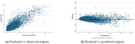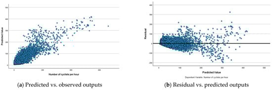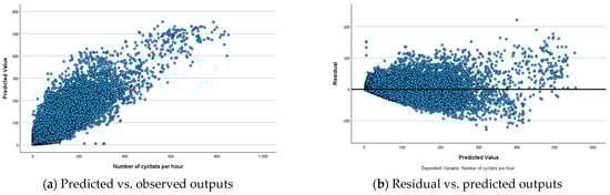 The residual-by-observed scatterplots were generated to analyse the distribution of residuals in relation to the predicted bicycle traffic (Figure 3b, Figure 4b and Figure 5b). In these plots, the y-axis represents the residuals, while the x-axis represents the predicted values of bicycle traffic. This visualisation helps assess the overall fit and behaviour of the network’s predictions. The residual-by-predicted scatterplots for three scenarios exhibit a well-behaved and randomly scattered pattern, indicating a good model fit. ANN models effectively captured the underlying relationships for these scenarios without significant bias. The residuals formed a horizontal band and randomly fluctuated around the zero-line, indicating well-fitted models with few outliers (Figure 3b, Figure 4b and Figure 5b). However, these outliers did not significantly affect the estimation of ANN models, ensuring the robustness of overall model performance.