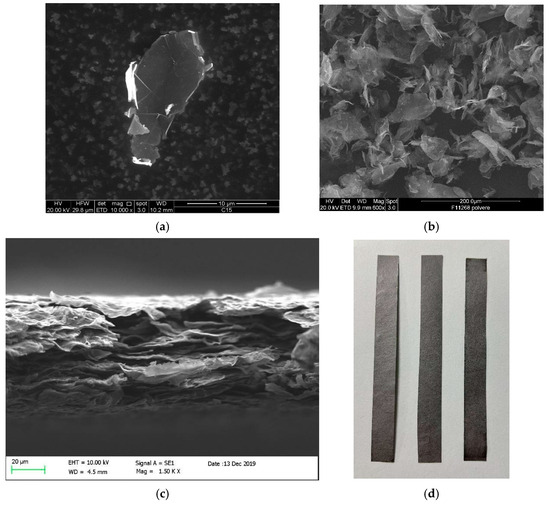 Specifically, the industrial process starts from a graphitic precursor, from which graphene nanoplatelets (GNPs) are produced through thermal expansion and liquid-phase exfoliation [18,19]. Figure 1a presents a Scanning Electron Microscope (SEM) micrograph of a single GNP, taken with a ZEISS LEO 1530 FEG, 5 kV, 5 mm working distance (Oberkochen, Germany). These GNPs have typical lateral dimensions in the tens of microns and average thicknesses of approximately 12 nm. The GNP has an aspect ratio of 3.100, which indicates a highly exfoliated material. Other techniques suitable for mass production, such as wet-jet milling [18] and microwave irradiation [20], can achieve similar characteristics.