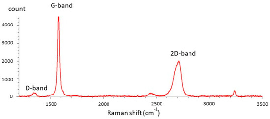 The SEM images provided in Figure 1b,c show the random structure of the GNP agglomerate and a side view of the GNP film, respectively. The properties of the resulting composite are heavily influenced by the size of the graphene nanoplatelets (GNPs) used in the manufacturing process. To achieve superior thermal and mechanical performance, thinner GNPs are preferable [32]. At the same time, for enhanced electrical conductivity, the size/thickness aspect ratio, size, and surface area [33] of the GNPs should be considered. Therefore, it is essential to use manufacturing processes that allow precise control over the dimensions of the GNPs. The quality of the manufacturing process in terms of defects is checked by a Raman spectroscopy analysis, whose result is plotted in Figure 2. Indeed, the low intensity and broadness of the D-band associated with the high intensity and sharpness of the G-band indicate a low concentration of defects in the surface of the material, assessing the degree of structural disorder, as shown in [34,35]