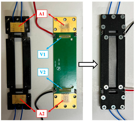 This paragraph describes the measurement system and methodologies employed for the thermo-electrical characterization of the GNP-based temperature sensor. A custom test fixture was used throughout the measurement campaign, enabling the stable attachment of the nanosensor electrodes and establishing consistent measurement points. This setup ensured system stability during testing, enhancing the results’ reliability. The test fixture was also designed to incorporate a four-terminal configuration; in Figure 3, A1 and A2 are the amperometric terminals, which are larger to reduce contact resistance, while V1 and V2 are the volumetric ones, which are thinner, to allow for precise identification of measurement points. The four-wire method inherently excludes contact resistances from the electrical circuit, so calibration is unnecessary to compensate for the contact resistances. However, parasitic contact resistances were preliminarily estimated to comprehensively characterize the system, as the difference in the resistance measured with both 2-wire and 4-wire techniques.