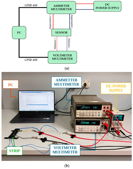 Schematic (a) and picture (b) of the setup for the preliminary electrical characterization.