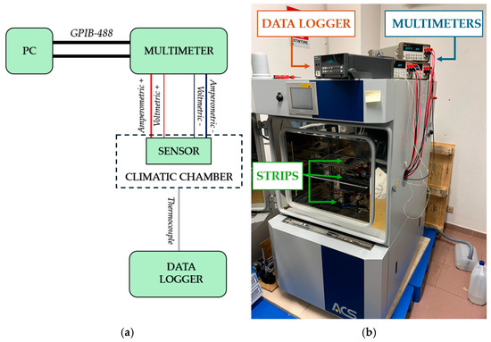 The tests measured the sensor resistance at different temperature set points for the electro-thermal characterization. Multiple GNP strips were simultaneously placed in a programmable climatic chamber, and resistance measurements were taken at each temperature level for each strip. An Agilent 34401A multimeter, remotely controlled via the GPIB-488 interface, was employed to measure the resistance of each sensor using a four-wire measurement technique, minimizing the impact of contact resistances. The multimeter was set to its minimum range and highest resolution to achieve maximum accuracy. The environmental conditions during the tests were controlled using the ACS DY110 climatic chamber (Angelantoni, Massa Martana, Italy), which enabled precise adjustments of temperature and humidity levels. The setup is described in Figure 5.