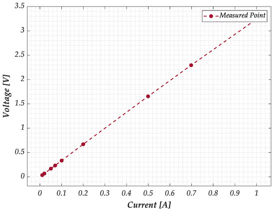 In this paragraph, the results of the preliminary characterization and calibration are presented. The following current values were applied to power the sensor to determine the V-I characteristics of the GNPs strips: [0.01, 0.02, 0.05, 0.07, 0.1, 0.2, 0.5, 0.7, 1] A. For each current set point, 10 voltage and current measurements were acquired in an ammeter-voltmeter configuration. The final V-I curve was generated by averaging all the measurements for each current level, showing a linear relationship for all samples. Figure 6 shows, as an example, the result obtained with G−PREG 50/50.
