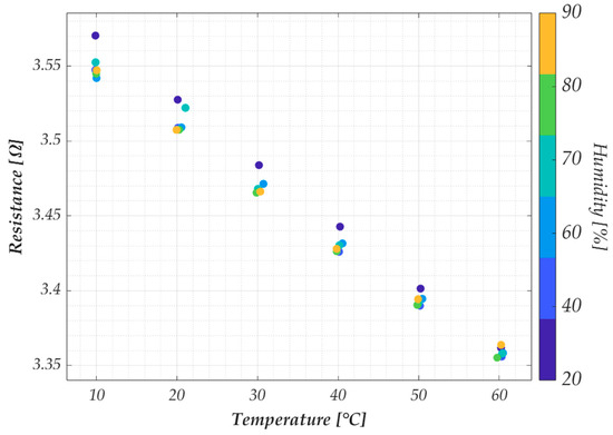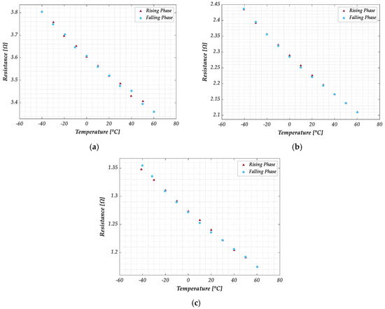 Note that 10 measurements of resistance and temperature were collected and averaged for each temperature level to obtain the results. Moving from one temperature level to the next, it was required to reach steady-state conditions, which were confirmed by ensuring that the temperature difference between the chamber’s thermocouple and the data logger’s thermocouples was less than 0.5 °C. A medium stabilization time of 20 min was necessary at each temperature level.