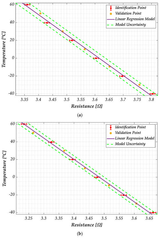 Plots of the temperature versus the electrical resistance according to the linear model in Equation (16), for the two considered samples of the G−PREG 50/50 films: (a) sample 1, and (b) sample 2. The red dots indicate the values adopted for identifying the model, whereas yellow dots are the values used to validate it. The red bars represent the uncertainty on the measurements, and the dashed green lines describe the estimated model uncertainty.