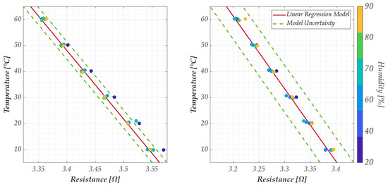 Plots of the temperature versus the electrical resistance according to the linear model in Equation (16), for the samples 1 (left) and 2 (right) of the G−PREG 50/50 films, for different values of relative humidity from 20% to 90%. Colored dots are the measured values, whereas the solid red line is the sensor response and the green dashed lines represent the model uncertainty.