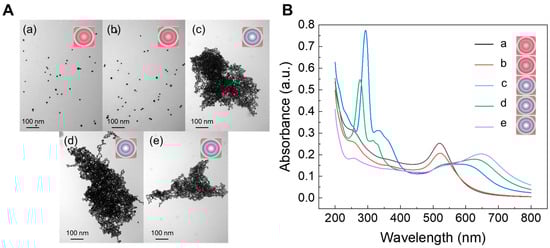 The possible detection mechanism of MOX/CIP and Cr(III) using ATG-AuNPs is shown in Scheme 1. The AuNPs employed in this study were synthesized via the well-established citrate-reducing approach, and then the AuNPs were modified and stabilized by the ATG ligands. This is likely because the Au-S bond was utilized to bind ATG on the surface of the AuNPs via a self-assembly reaction, similar to that previously reported in the paper [53]. After adding MOX and CIP containing fluorine in their chemical structure, the fluorine can interact with the carboxyl group of ATG selectively, induce aggregation of the ATG-AuNPs, and change the color from wine-red to blue-gray. In addition, in the presence of Cr(III), the carboxyl group of ATG can effectively capture and chelate Cr(III) ions, forming stable octahedral hexacoordinate complexes (excluding two solvent water molecules) [54,55,56]. This coordination interaction induces the aggregation of the ATG-AuNPs, along with a color change. As shown by transmission electron microscopy (TEM), the AuNPs and ATG-AuNPs displayed a nearly spherical shape, uniform particle size, and excellent dispersion. The average diameter of AuNPs is approximately 13 nm (Figure 1A(a,b)). Owing to their capacity to undergo interparticle surface plasmon coupling, the obtained diameter was appropriate for the colorimetric detection (>3.5 nm), resulting in a noticeable color change from wine-red to blue-gray at the level of the nanomolar concentration. Once MOX/CIP and Cr(III) were added to a dispersion of the ATG-AuNPs nanoprobes, the rigid structure formed was insufficient to stabilize the AuNPs solution, leading to the aggregation of AuNPs (Figure 1A(c–e)).