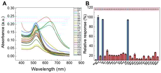 Furthermore, the aggregation of the ATG-AuNPs reduced the absorbance at a wavelength of 520 nm while increasing it at 600~650 nm. The sensitivity dependent on MOX reached a maximal value at A600/A520 and remained unchanged at the larger wavelength (Figure S3). Therefore, the detection wavelengths were determined to be A600/A520. Additionally, the detection wavelengths for CIP and Cr(III) were fixed at A640/A520 and A650/A520, respectively (Figures S4 and S5).