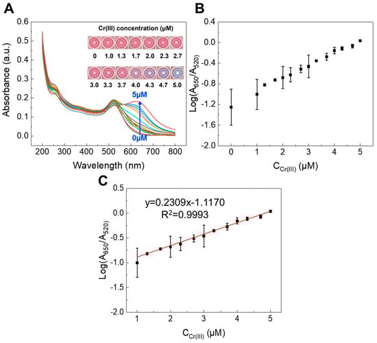 The detection of Cr(III) using the ATG-AuNPs. (A) The change in the UV–Vis absorption spectra was recorded for the ATG-modified AuNPs upon increasing the CIP concentration; inset: photos showing the corresponding sample color. (B) The relationship between Log(A650nm/A520nm) and the Cr(III) concentration. (C) The linear calibration curve with different concentrations Cr(III) (0~5.0 µM).