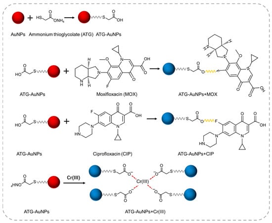 Among the detection techniques, colorimetric sensors have attracted considerable attention since they facilitate simple, rapid, and real-time measurement without sophisticated apparatus [29]. Gold nanoparticles (AuNPs) are frequently employed as colorimetric reporters due to their distance-dependent optical properties [30]. The extinction spectra of AuNPs and their absorbed and dispersed light wavelength depend on the interparticle distance [31]. Therefore, systems based on the analyte-driven aggregation of AuNPs have been utilized for the colorimetric sensing of specific analytes through detection reporters on the AuNPs [32,33,34,35,36,37,38,39]. Notably, the ability of a single sensor to simultaneously detect multiple analytes has recently gained significant attention, owing to advantages including cost reduction and improved analytical efficiency [40,41,42,43,44]. Consequently, the design and synthesis of colorimetric sensors exhibiting high selectivity and sensitivity toward MOX, CIP, and Cr(III) have attracted increasing attention [45,46,47]. Recent advances have led to the development of several colorimetric chemical sensors capable of detecting MOX, CIP, and Cr(III) in diverse industrial applications [48,49,50,51]. Nevertheless, conventional detection methods for MOX, CIP, and Cr(III) are typically performed separately. To date, the simultaneous detection of these three analytes using a single molecular platform has rarely been documented to the best of our knowledge. To address this limitation, we designed and synthesized a novel ammonium thioglycolate (ATG)-functionalized AuNP-based system and systematically evaluated its multi-analyte recognition capabilities. This system is anticipated to function as a versatile multi-analyte recognition sensor in metal ion detection, providing the simultaneous identification of multiple analytes within a single assay.