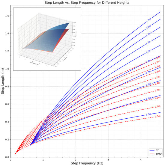 Surface plot illustrating the relationship between step frequency, standing height, and step length in children and adolescents with Duchenne muscular dystrophy (DMD) (red) and typically developing controls (blue). The model is based on Equation (1). The curves illustrates the relationship between step length and step frequency at various heights, as modeled by Equation (1), for TD individuals and those with DMD. The plotted curves represent the regression model, with the blue line depicting TD participants and the red dotted line representing DMD participants.