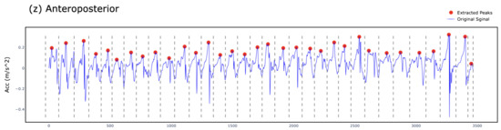 Figure 4. In SC-L1, the raw acceleration signal is represented by the blue time-series, while the red dots indicate the highest peak in each step. The represents the maximum acceleration value in the ith step, where m is the total number of steps in the SC-L1 activity. The gray dotted vertical lines denote the edge duration of each step. These peak values are subsequently used to compute the mean and standard deviation, which serve as the basis for dynamically determining the threshold. - III