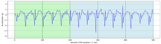 - Determine the Active Duration Time in Each TW:We collect z-axis acceleration data at the slowest speed (SC-L1—very slow walking) and compute the threshold, defined as follows:where denotes the highest peak in a single step at index i, with the number of steps in SC-L1 ranging from to m.This threshold, represented by the red horizontal line in Figure 3, is computed using the mean () and standard deviation () of peak values in SC-L1 as shown in Figure 4. If the maximum G-force in any 1 s period within the TW is greater than this threshold, that second is classified as active time (highlighted in green). Otherwise, it is classified as inactive time (highlighted in red). This classification rule is applied to every second within the TW.