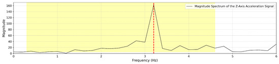 Figure 6. Fast Fourier Transform (FFT) analysis of accelerometer data within a 5 s time window. The figure highlights the dominant step frequency component extracted for gait cycle estimation.- is the raw acceleration signal recorded within a given TW.