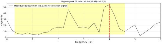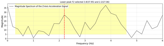 - If two peaks exist and the lower-frequency peak is less than of the highest frequency peak, but its magnitude is at least of the highest frequency peak, then the smaller peak is selected as the as shown in Figure 7. Otherwise, the highest frequency peak is determined as the as shown in Figure 8. In some cases, particularly during running or advanced Trendelenburg-style gaits with a pronounced lateral component, we observed harmonic patterns in the frequency spectrum in which a higher-magnitude peak appeared at approximately twice the actual step frequency.
