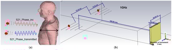 Figure 1a illustrates the fundamental principle of measuring the phase variation of the S21 parameter. It should be noted that the full human body shown in the figure was not used in the conducted simulations; its depiction provides a better understanding of the general concept of the measurement. The main idea is to measure how the electromagnetic wave transmitted from the first antenna travels through the space, interacts with the chest (due to breathing or heartbeat movements), and is received by the second antenna. The S21 parameter specifically refers to the transmission coefficient between the two antennas—that is, it tells us how much of the transmitted signal reaches the receiving antenna and what its phase shift is. The phase shift of S21 indicates how the distance or movement of the chest modulates the phase of the wave during transmission (not reflection). In contrast, reflection measurements (like those involving the S11 parameter) focus on signals that bounce back to the same antenna. Here, the interest is in the transmitted wave passing through the chest and being received at the other side, providing information about movement based on changes in the transmitted wave’s phase during this passage. Thus, this measurement is transmission-based, not reflection-based. Figure 1b details the exact geometrical configuration used in the CST Studio Suite simulation environment, including the precise location of the antennas with regard to the planar PEC target (yellow parallelepiped) as well as the exact dimensions and distances between the simulated system components. Thus, the 500 mm distance between the antennas and the target, the relative distances between the antennas, as well as the incremental direction of the target displacement (explicitly marked by the black arrow) are clearly indicated. This detailed representation supports the accuracy of the reproduction of the experimental conditions and validates the consistency of the parameters used in the numerical analysis.