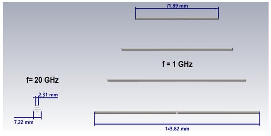 A dimensional sizing comparison between the Yagi antennas designed for 1 GHz and 20 GHz (grey colour: antenna elements; blue color: dimensional signs).