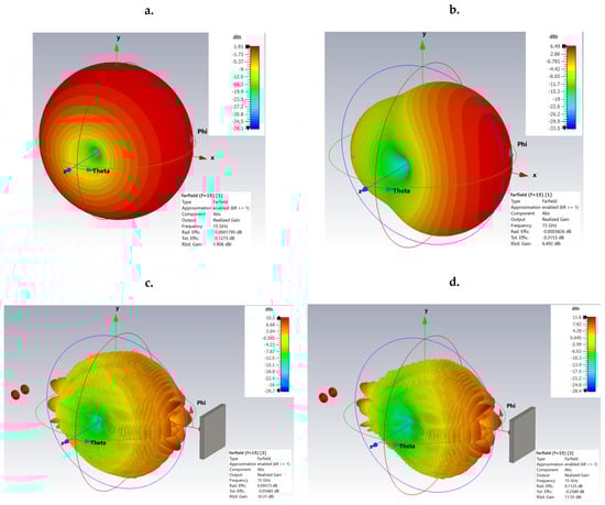 Three-dimensional radiation patterns of the simulated antennas: (a) 15 GHz dipole antenna; (b) 15 GHz Yagi antenna in free space; (c) 15 GHz Yagi antenna in the presence of a reflecting object; (d) 15 GHz Yagi antenna with an increased gain in the presence of a reflecting object.