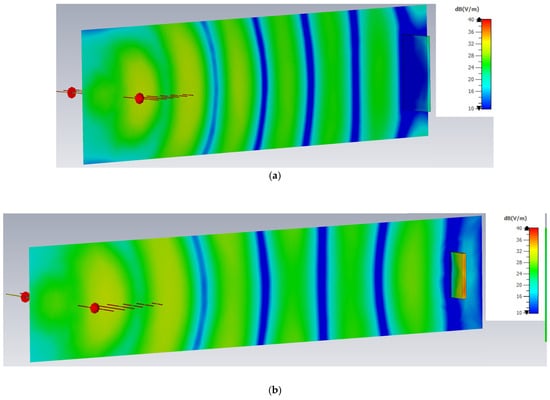 Regarding the use of computational situations in far-field conditions only, Figure 5 demonstrates the distribution of the field along the propagation path at the lowest frequency of 1 GHz in two cases: (a) when the distance between the antenna and the PEC target is 500 mm (as in all of the considered scenarios) and (b) when it is doubled to 1000 mm, for observing the difference in the planar wave-front image. In both cases, the target is present in front of the antenna system.