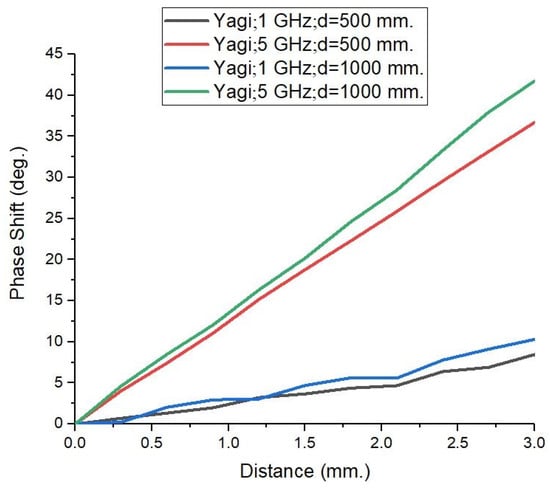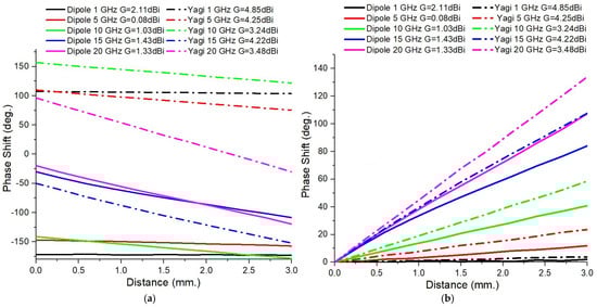 Figure 6a compares the dependence upon the distance between the target and the antenna of the S21 phase shift for the two types of antennas. These cases correspond to the situation in which the Doppler target is made of a PEC. The S21 phase shifts during the target movement highly depend on the frequency, with Yagi antennas exhibiting more stable behavior at low frequencies and dipoles exhibiting more pronounced variations at higher frequencies.