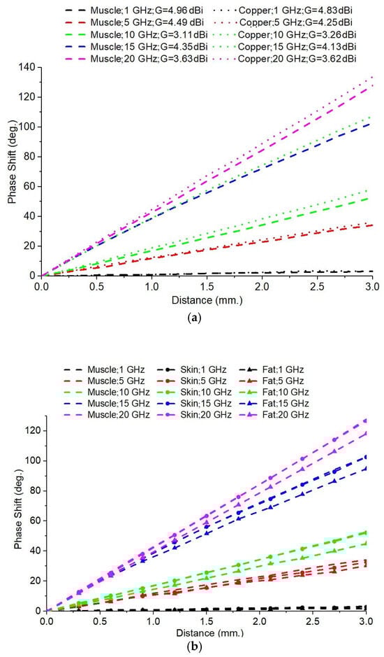 Figure 8a shows the variation of the S21 phase with the displacement of the target for the two types of materials when using the 5-element Yagi antenna. The S21 phase shift was generally lower for muscle tissue compared to the copper target. This can be explained by the fact that muscle tissue has high losses and significantly lower conductivity than copper, leading to weaker reflection. For almost all of the frequencies, the slopes of the curves associated with muscle tissue are lower than those corresponding to copper. This suggests that lossy dielectric materials, such as muscle tissue, reduce the phase shift amplitude and delay the phase of the transmitted signal. For frequencies of 1 GHz, 10 GHz, 15 GHz, and 20 GHz, the differences between muscle tissue and copper are more pronounced at higher antenna gains, suggesting a stronger interaction between the radiated field and the reflecting material for more directive antennas.