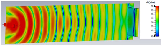 Figure 9 illustrates a representative example of the E-field strength distribution in air just tangent to the surface of the planar target, generated by the 5 GHz Yagi antenna on the skin tissue, showing the propagation of the electromagnetic wave and its interaction with the planar target positioned at a fixed distance from the antenna. This graphical representation was used to compute the average E-field strength on the target’s surface, and it was essential in performing the multiple linear regression analysis.