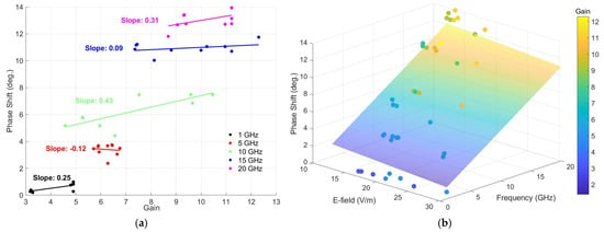 (a) The dependence of the average S21 phase shift on the antenna gain for each frequency (the slopes of the linear regression curves are shown); (b) a 3D model of the relationship between the average phase shift (recorded at a 3 mm displacement of the planar target), the frequency, the maximum antenna gain, and the average E-field strength on the target’s surface.