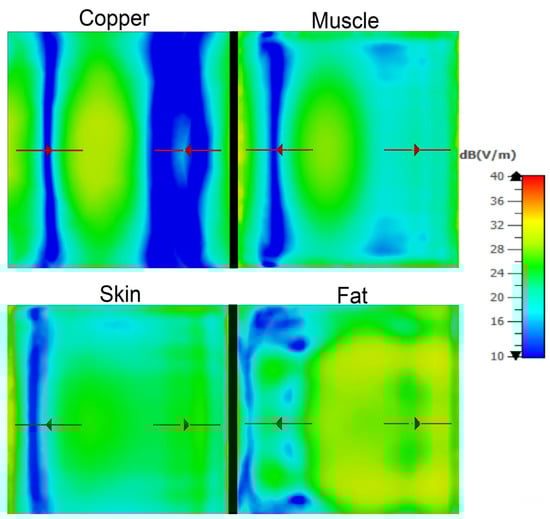 The distribution of the E-field strength on the surface of different materials composing the Doppler target (copper, muscle, skin, and fat adipose tissue) at 5 GHz in the same Doppler configuration.