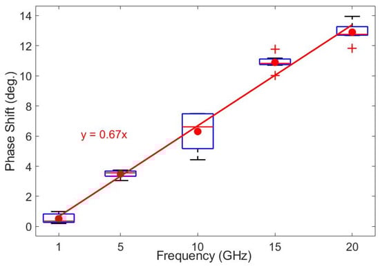 Summarizing all of the 40 cases studied (see Figure 10a), we present the boxplot statistics marking the most important factor that influences the transmission phase shift change, namely the used frequency. As observed in Figure 12, almost all boxplots present small interquartile ranges (with the exception of 10 GHz), proving that the other tested independent variables have a lower influence. For the studied situation, a linear regression was conducted, and the slope of the curve of the phase shift dependence upon the frequency was 0.67, proving the very good prediction capability of our model based essentially on the frequency dependence of the Doppler radar sensitivity.