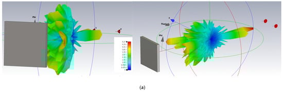 Figure 4 shows the three-dimensional radiation patterns for four relevant situations: (a) 15 GHz dipole antenna—highlighting the omnidirectional distribution and low gain; (b) 15 GHz Yagi antenna—illustrating the high directivity; (c) 15 GHz Yagi antenna in the presence of the target—showing its effects on the radiation pattern due to reflection; and (d) 15 GHz Yagi antenna with a higher gain and in the presence of the same reflecting target—demonstrating the increased interaction and additional influences on the radiation due to the increased antenna gain.